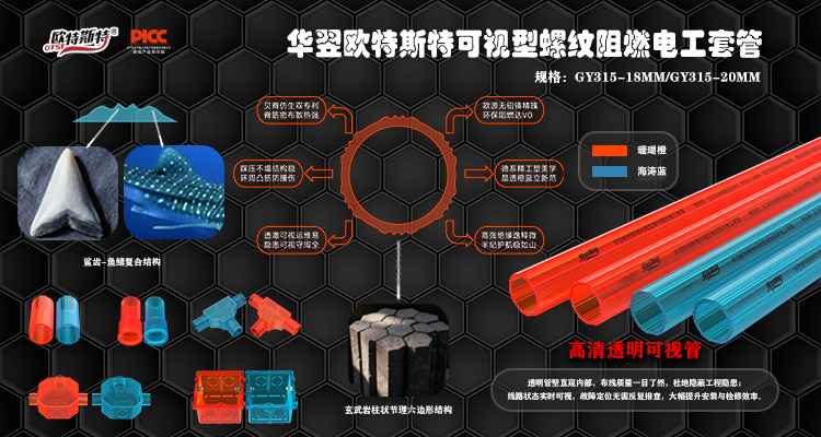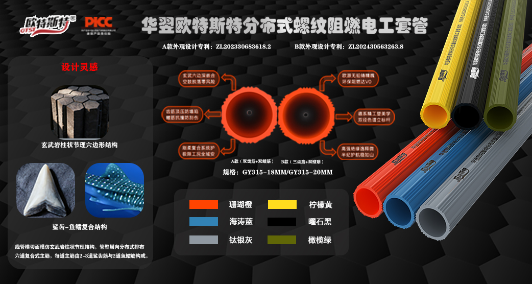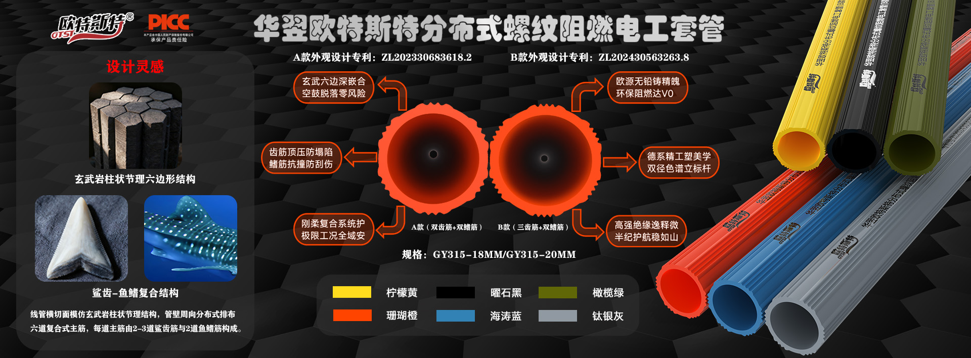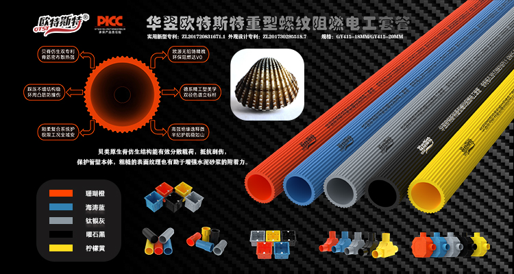 华翌欧特斯特重型螺纹阻燃电工套管,是我公司推出并拥有双专利(实用新型:ZL201720831671.1;外观设计:ZL201730295518.7)的核心产品。该产品突破性地采用管壁周身精密分布的深海贝类原生脊外形设计,赋予管壁卓越的抗压性能,其抗压强度达到GY415级别,可稳定承受高达1250N的压力,为电气线路提供坚实可靠的防护保障。本品的核心优势在于其独特的贝类原生脊仿生结构。这些环绕管壁周身的贝类脊状凸筋造型,灵感源自深海贝类抵御高压环境的坚固壳体形态。其独特的轮廓显著增强了管材的抗压承载能力。当线管承受压力时,贝类脊状凸筋如同坚固的骨骼支架,能高效分散并承载垂直方向的巨大负荷,有效抵...